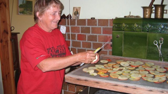 w Dylakach, niedaleko Ozimka. „Przepis na suszone jabłka przejęłam od swojej mamy. Podobnie suszono owoce w rodzinie mojego męża – u babci Marii, która w tej chwili miałaby 106 lat – mówi Pani Iwona. Suszone jabłka zabierają bardzo mało miejsca, a odpowiednio przyrządzone nie ustępują w smaku świeżym owocom. Przez suszenie nie tracą nic ze swojej wartości, jedynie pozbawia się ich nadmiaru wody.