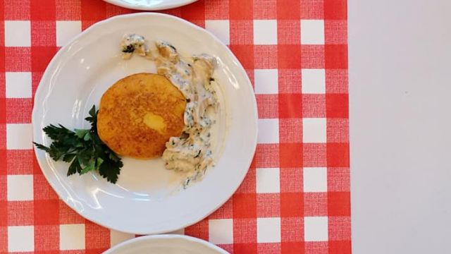 - Danie Główne: lwowskie kotlety ziemniaczano-dyniowe z soczewicą i sosem grzybowym