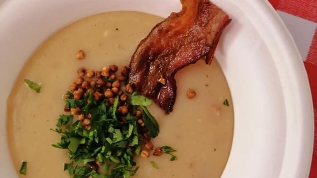 - Zupa: Krem z wędzonych ziemniaków na wodzionce z chipsem z boczku i popcornem z kaszy gryczanej