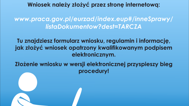 https://www.praca.gov.pl/eurzad/index.eup#/inneSprawy/listaDokumentow?dest=TARCZA. Na stronie znajduje się formularz wniosku, regulamin i informacja, jak złożyć wniosek opatrzony kwalifikowanym podpisem elektronicznym.